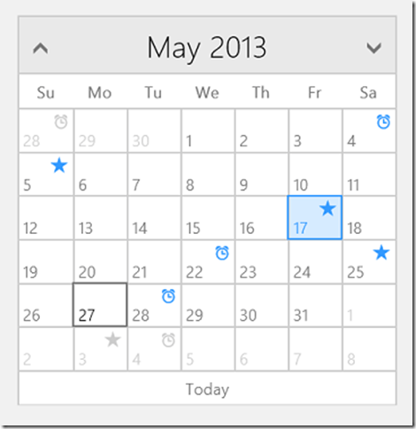 The RadCalendar includes the capability for adding clear indications about special dates, like national holidays, events, and other icons that enhance your users’ experience with your application. Some examples are shown in Figure 2.