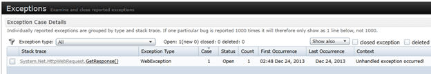 We can also see that the application encountered an exception. To view the details of the exception, click on Exceptions under Developers Reports, then click the “live” link in the lower-right hand corner. You will now see the exception that occurred be displayed in the grid, as well as the number of times that exception has been encountered.