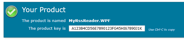 Now that we’ve registered our application you are presented with a product key that is unique to your application. (Please note that the key in the screenshot below is fictional)