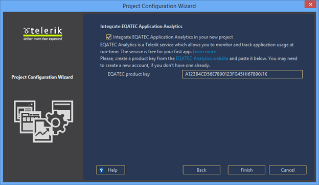 If you are just getting started with green-field development, the Telerik RadControls WPF Application project template has been updated with a dialog specifically geared to help you integrate analytics. Simply copy the product key from the website and paste it into the textbox. Also ensure the “Integrate EQATEC Application Analytics” checkbox is checked: