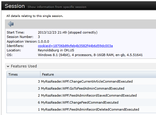 The user of this session switched feeds six times, drilled into a specific article 3 times, accessed the admin screen 3 times where they saved a couple feed records, and deleted one feed record. Some other helpful information gathered by the analytics monitor is the location of the user, as well as the operating system, default language and high level specifications of the user’s hardware. Such information can come in real handy when catering your application to the demographics of your users.