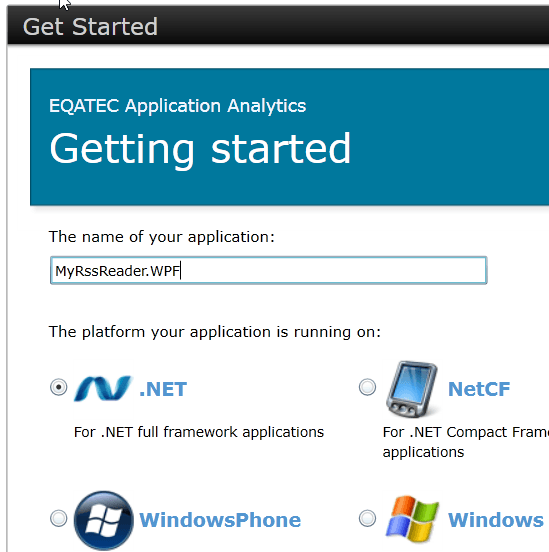 The first thing that you will need is an analytics account. Visit the analytics dashboard login page to register for a free account if you haven’t already done so. Now it’s time to log into your account and get started. In this example we will be instrumenting a WPF RSS reader client. In the Get Started pane on the screen register your application, in my case I’ve named it MyRssReader.WPF and selected that the platform the application is running on is .NET: