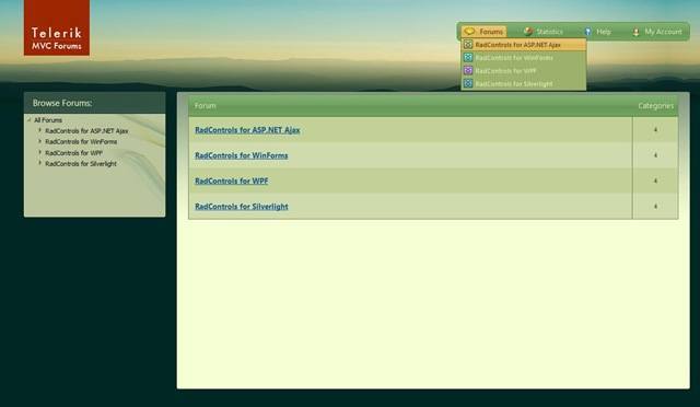 I am glad to announce that yesterday we released a public sample application built with RadControls for ASP.NET Ajax, ASP.NET MVC and Telerik OpenAccess. You can check the online demo, or download the source code. This application is a basic online forum which uses RadControls in ASP.NET and demonstrates integration with ASP.NET MVC. Here are a few screens from the forum: