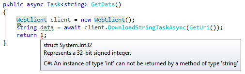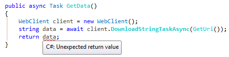 Since the return type is Task<string> and result is a string, JustCode correctly identifies this as valid. However, if the return type is not the type of T in Task<T>, the statement is marked as an error.
