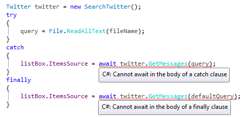 It is invalid to await from within a catch or finally block, and JustCode will alert you to these issues as well.