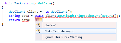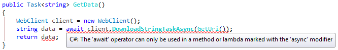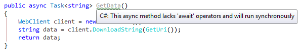 public async Task<string> GetData() { WebClient client = new WebClient(); string result = await client.DownloadStringTaskAsync(GetUri()); return result; }