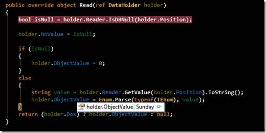 When reading the value we want to first check and see if it is null.  If it is null we go ahead and return the value 0.  If it is not null we parse the string that is stored in the database to get the actual Enum value.  We then return this value.