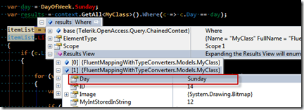 To use the converter all we need to do is specify it in our mapping configuration.  As you can see I use the WithConverter<T> method, using EnumToStringConverter<> as the type, which in turn uses the DayOfWeek type.