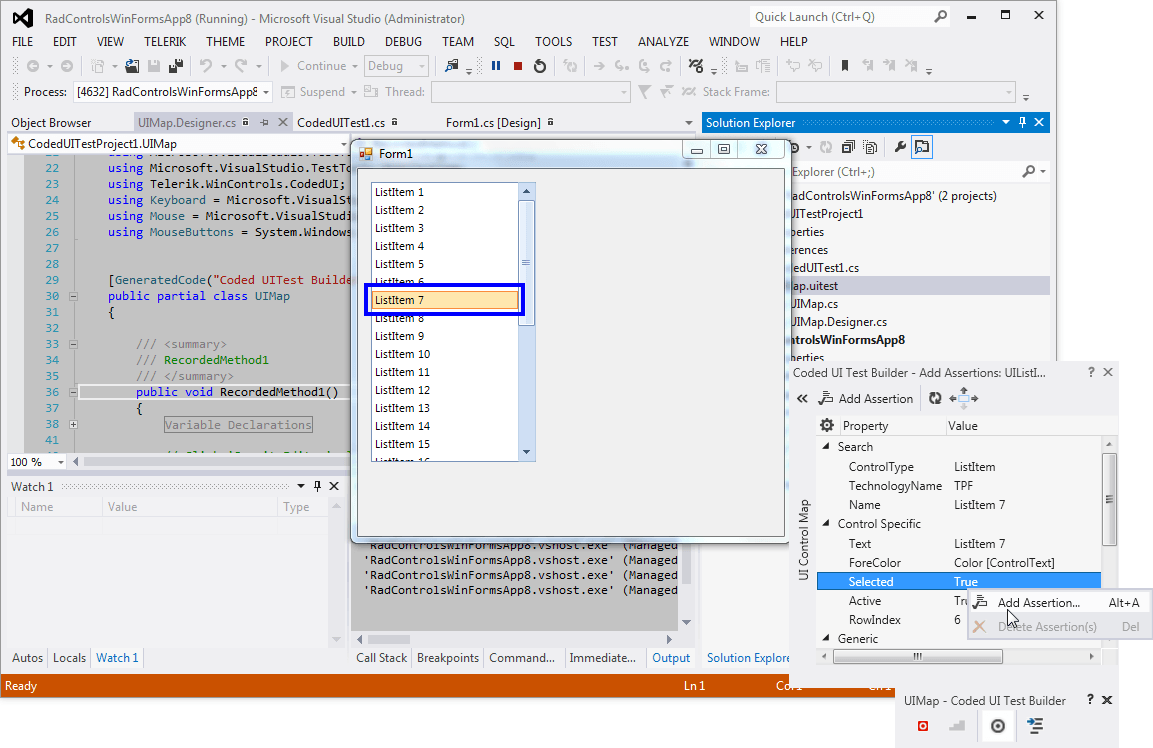 We did not stop there, however, and I am glad to inform you that as of Q3 2012 RadControls for WinForms suite will introduce full support for Coded UI Tests implementing all four Coded UI Test levels! These enhancements will be available not only in Visual Studio 2010, but in the brand new Visual Studio 2012 as well. So, in addition to the spy recognition and (Level 1) now you will be able to discover and evaluate RadControls-specific properties with ease, and also to record and playback tests with the newly discovered elements (Level 2):