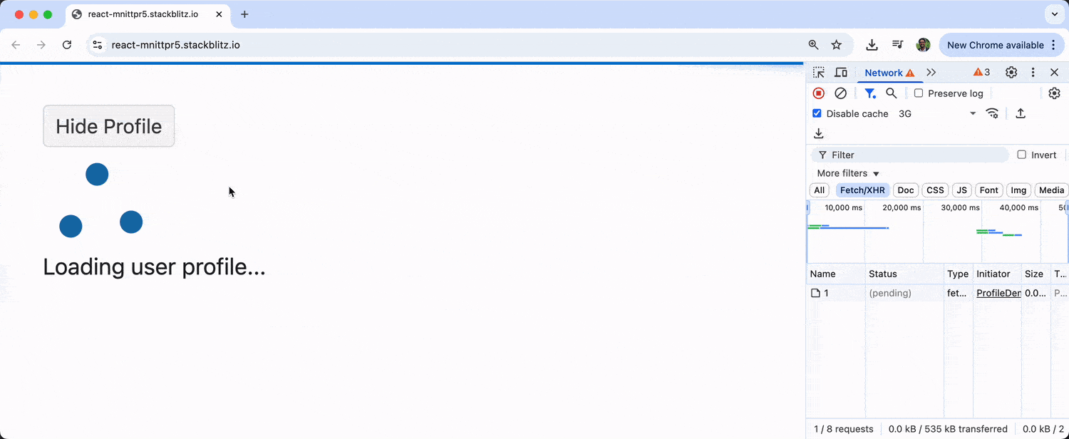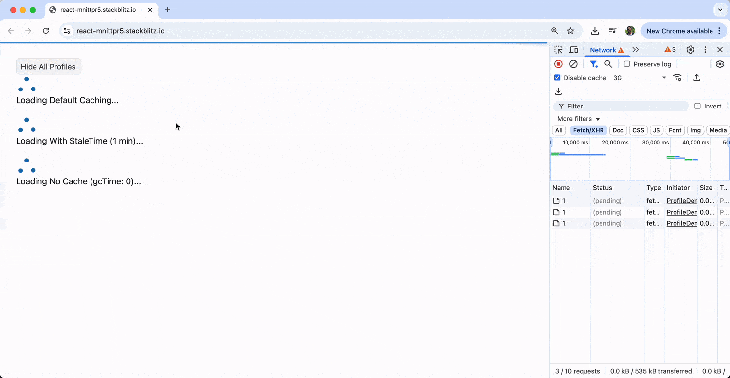 With a 30-second gcTime, if we use the “Hide Profile” button in our ProfileDemo and wait more than 30 seconds before clicking “Show Profile” again, we’ll see the loading spinner because the cache was garbage collected.
