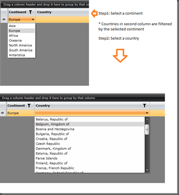 We bind the first combo column to a list of continents, and the RadGridView to a list of locations.