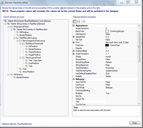 Click OK, to both the Color dialog and “Element hierarchy editor” and your RadMenu BackColor should now reflect your new color.