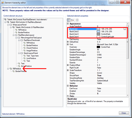 Within the Element hierarchy editor, select the FillPrimitive entry at the bottom of the TreeView. You will see that the BackColor is actually a gradient which is managed by the BackColor, BackColor2, BackColor3 and BackColor4 properties.