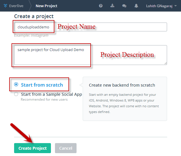 In the “New Project” dialog, enter project name, description, select “Start from scratch” radio button and click on “Create Project” button.