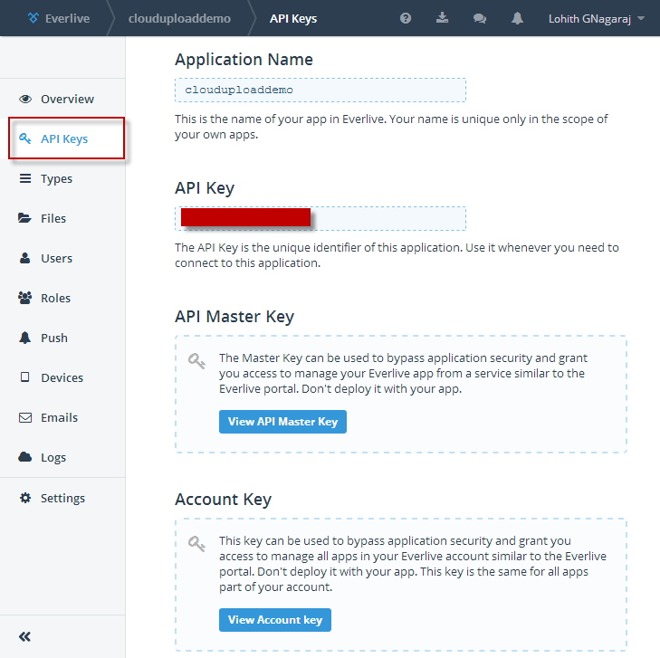 In order to integrate with Everlive i.e. uploading to or reading files from Everlive from any application, you will need to have access keys. You can get access keys to your projects, by clicking on “API Keys” in your project dashboard. Note down the application name and the application key. We will need this information when we integrate with RadCloudUpload.
