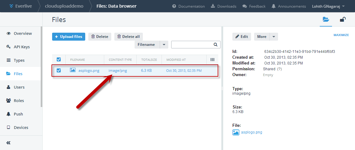 At this point if we jump back in to Everlive project dashboard and Files section, you should see the file we just uploaded. Here is the screenshot of the Files on everlive: