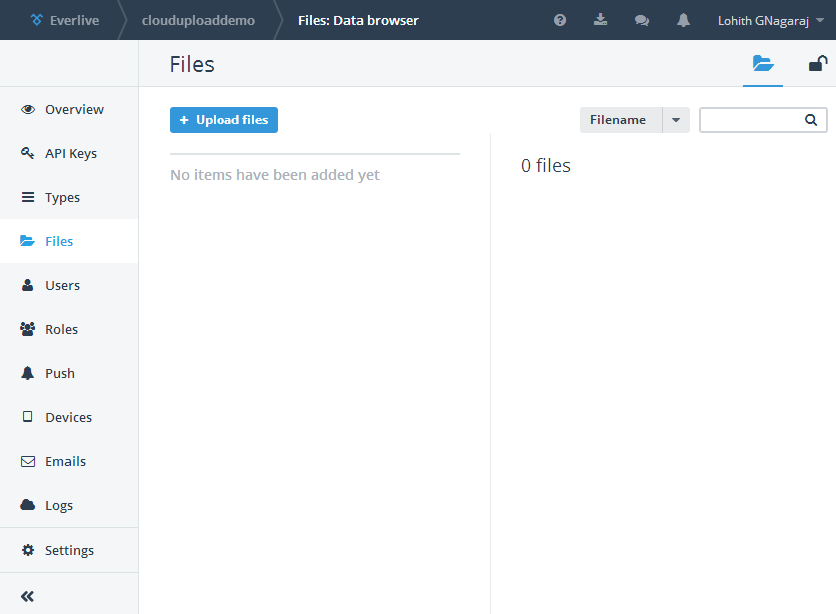 Notice that, Everlive has out of the box added Files, Users and Roles entity types. Files entity type is like container to which you can readily add files. Click on Files link on the left hand menu to look at Files screen: