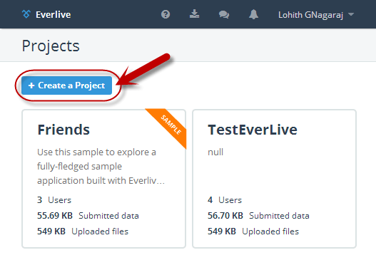 You can sign up for free and you get a developers account which gives you unlimited API calls, 10K push notifications, 100MB of DB space, 1GB of file storage and 5GB of bandwidth. Once you log into your Everlive account, you can create a new project. Click on “Create a Project” from the Everlive dashboard.
