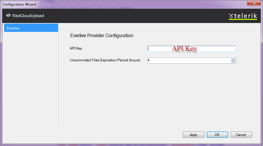 <telerik.web.ui> <radCloudUpload> <storageProviders> <add name="Everlive" type="Telerik.Web.UI.EverliveProvider" apiKey="<YOUR API KEY>" uncommitedFilesExpirationPeriod="1" /> </storageProviders> </radCloudUpload> </telerik.web.ui>