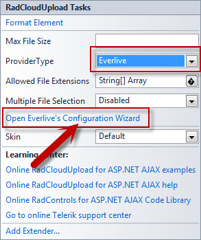 From the tool box drag and drop RadCloudUpload control on to Default.aspx page. Access the smart tag of the control and choose Everlive as the provider type. Then click on the “Open Everlive’s Configuration Wizard”.