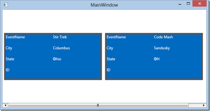 The MainEvent consists almost entirely of a RadTileList. There are two parts to creating this list; the header and the DataTemplate. The header sets the ItemsSource to bind to the Events collection. The data template provides bindings to the event’s name, city, state and id.