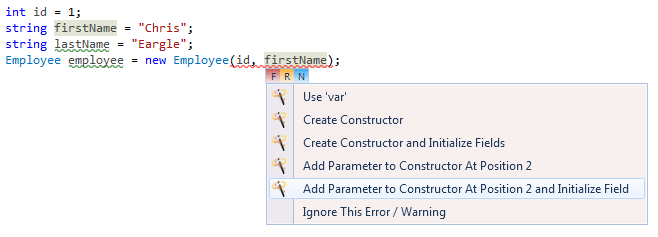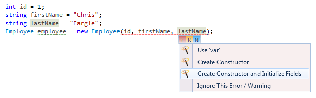 There are two options on the quick fix list. Create Constructor will create an empty constructor that matches the signature. Create Constructor and Initialize Fields does the same but will initialize the fields as well. This fix uses the variable names from the argument list to match fields or properties. If there is no match, or if values are passed, it will create new fields on the class.