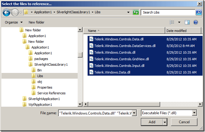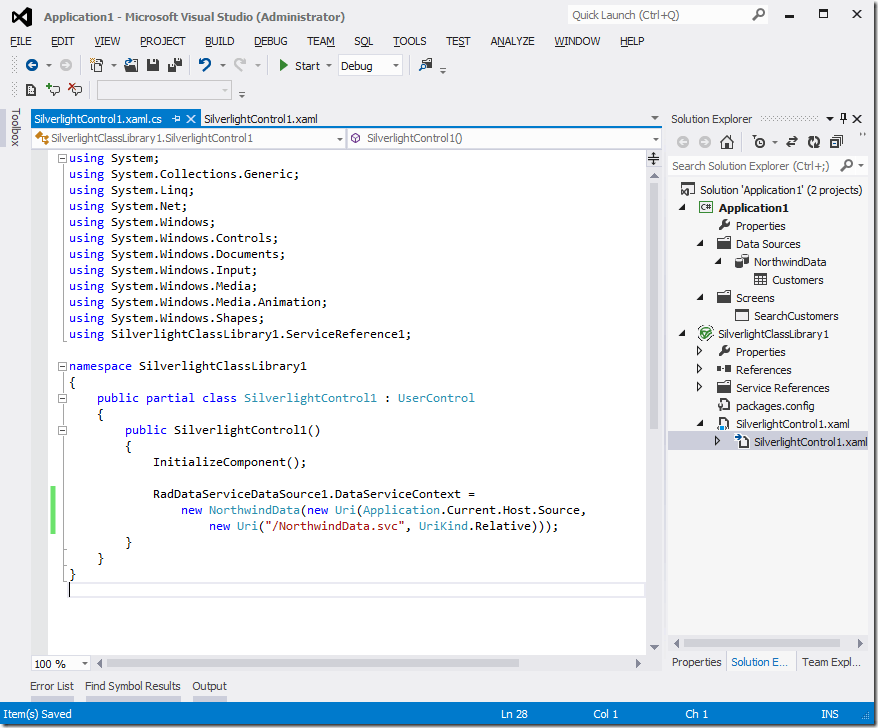 4) Add Telerik assemblies and declare desired components. In this case I’m using RadGridView, RadDataPager and RadDataServiceDataSource: