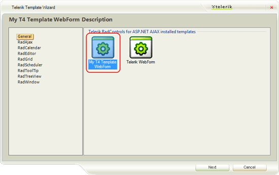 Below is a basic way to get started with a “RadControls for ASP.NET AJAX” T4 Item Templates.