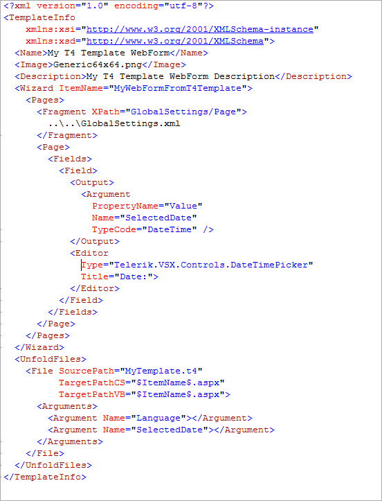 2. Create a file TemplateInfo.xml. This is basically the file that contains XML that the wizard can read to understand how it should display your template. See code sample below.