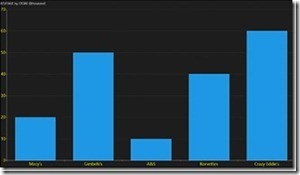 publicclassStoreRevenue{publicstringStoreName {get;set; }publicdoubleAmount {get;set; }publicstaticObservableCollection<StoreRevenue> GetStoreRevenue(){var revenues =newObservableCollection<StoreRevenue>();revenues.Add(newStoreRevenue() { Amount = 20, StoreName ="Macy's"} );revenues.Add(newStoreRevenue() { Amount = 50, StoreName ="Gimbels's"} );revenues.Add(newStoreRevenue() { Amount = 10, StoreName ="A&S"} );revenues.Add(newStoreRevenue() { Amount = 40, StoreName ="E. J. Korvette"} );revenues.Add(newStoreRevenue() { Amount = 60, StoreName ="Crazy Eddie's"} );returnrevenues;}}
