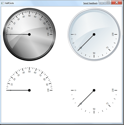 <Grid> <telerik:RadialGauge HorizontalAlignment="Left" Margin="10,8,0,0" Width="300" Height="300" VerticalAlignment="Top" d:LayoutOverrides="Height" > <telerik:RadialScale StartAngle="180" SweepAngle="180"> <telerik:RadialScale.Indicators> <telerik:Needle /> </telerik:RadialScale.Indicators> </telerik:RadialScale> </telerik:RadialGauge> <telerik:RadialGauge HorizontalAlignment="Right" Margin="0,8,8,0" Width="300" Height="300" VerticalAlignment="Top" d:LayoutOverrides="Height"> <telerik:StyleManager.Theme> <telerik:VistaTheme /> </telerik:StyleManager.Theme> <telerik:RadialScale MajorTicks="4" StartAngle="180" SweepAngle="-180"> <telerik:RadialScale.Indicators> <telerik:Needle Value="25" /> </telerik:RadialScale.Indicators> </telerik:RadialScale> </telerik:RadialGauge> <telerik:RadialScale StartAngle="180" SweepAngle="180" HorizontalAlignment="Left" Margin="10,323,0,33" Width="300" Height="300"> <telerik:RadialScale.Indicators> <telerik:Needle /> </telerik:RadialScale.Indicators> </telerik:RadialScale> <telerik:RadialScale MajorTicks="4" StartAngle="180" SweepAngle="-180" HorizontalAlignment="Right" Margin="0,323,8,33" Width="300" Height="300"> <telerik:RadialScale.Indicators> <telerik:Needle Value="25" /> </telerik:RadialScale.Indicators> </telerik:RadialScale> </Grid>