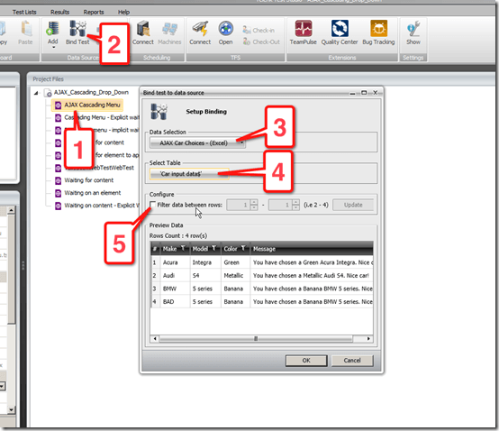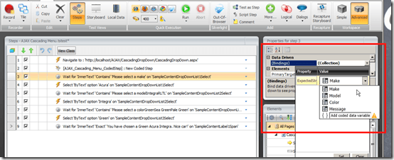 We’ve added a nice enhancement to our data binding experience in the latest release of Test Studio. We’ve simplified configuring bindings in test steps by providing you menu selections of available data parameters to bind to the step.