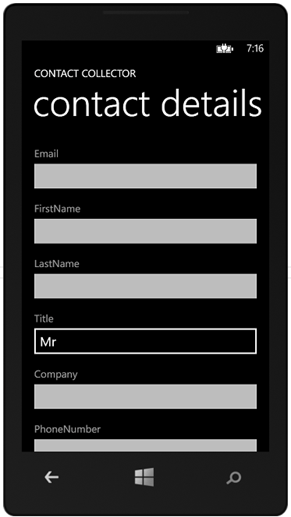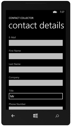 We are going to use the DataForm to automatically generate our UI in our app, so let’s begin by adding a class to this project to collect contact details. As you can see from the screenshot, the contact details on the first page consist of: E-mail, First Name, Last Name, Title, Company and Phone Number. You can name the class Contact and we will add the other fields later. The code that is contained in this file looks like the following: