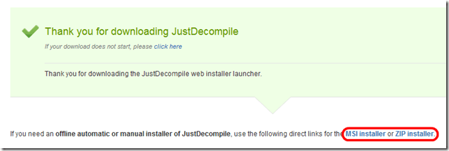 If you want the individual JustDecompile installers to either avoid this screen or archive for later use, those are available too. When you clicked the link to download the trial, it takes you to a download page that starts the download to the web installer launcher. However, there are also two other links on that page to the MSI Installer and the zip package.