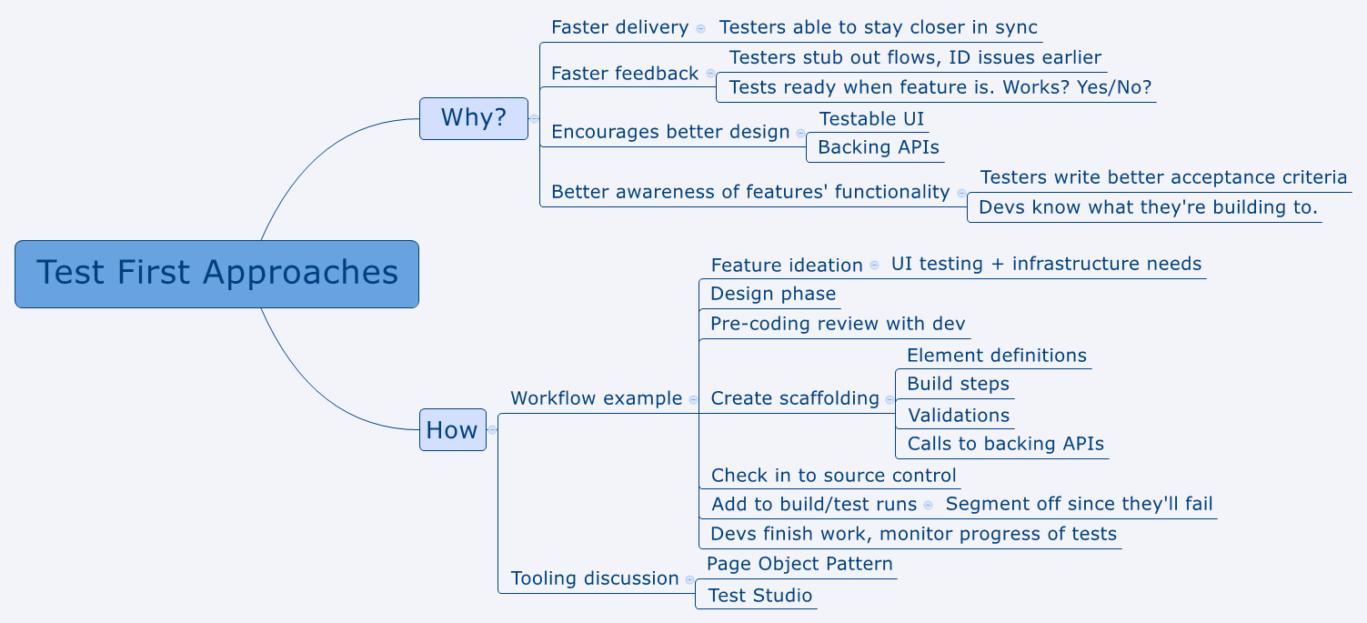 Many organizations are seeing tremendous benefits in moving to one of the various test-first methodologies such as Test Driven Development (TDD), Behavior Driven Development (BDD) or Acceptance Test Driven Development (ATDD). Test-first approaches improve team communication effectiveness, dramatically shorten feedback cycles and get testing activities working in parallel with development versus happening after development is complete.
