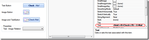 For example, to switch the Button’s text from “Check Mail” to bolded and italic “Check Mail” formatting, you should change the text from “Check Mail” to “<HTML><b>Check</b> <i>Mail</i>”.