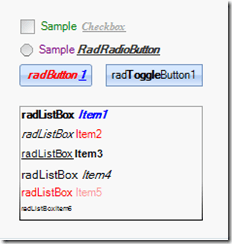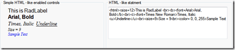 This release of RadControls for WinForms has the HTML-like formatting capabilities on a framework level. What does it mean? Well, as of now every VisualElement descendent is capable of rich text formatting - Labels, Buttons, RadCalendar, RadGridView, etc. The implementation is very simple, especially if your users are familiar with HTML. To turn on the rich formatting behavior you must begin your text with an <html> tag; use <size=[+|-]value> to set the font size used, and <br> to create a new line feed. To bold, underline and italic text styles, use the corresponding opening and closing tags (<i>, <b>, <u>). Font family is set through <font=Family> tag.