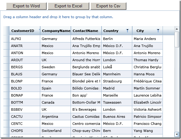 I’ve made small demo to demonstrate how to use all these in a Silverlight web application for Word, Excel and Csv export: