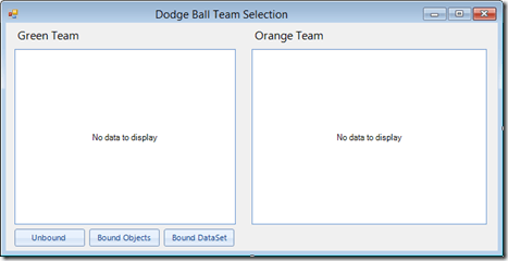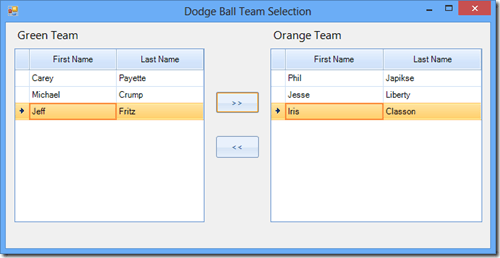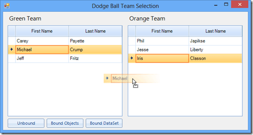 Go ahead and build and run the application. You are now able to build your Evangelists Dodge Ball dream team using drag and drop functionality in bound and unbound modes. You are also able to select multiple rows using either the shift or control key, and holding the key down while you drag the rows between the grids.