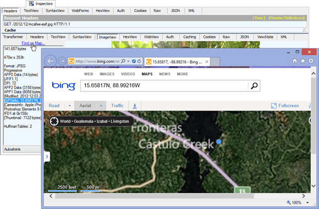 The original photo from that case can be found in an article that Sophos security wrote on the topic. If you view the photo in Fiddler v2.4.2.5 and later, the GPSInfo is extracted and displayed and the Find on Map… link appears. When clicked, the location is mapped using Bing Maps.
