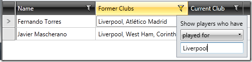 The focus of this blog is how to implement the IFilterDescriptor interface so that our data engine can filter your enumerable property. This interface allows you to provide a filtering expression. This expression will be used when the data engine performs the actual filtering. In the sample project that I have attached I have bound the grid to a list of football players. Each player has an IEnumerable<string> property called FormerClubs.