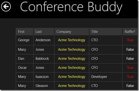 As noted in previous posts, I’m writing a Windows 8 application in XAML and C# named Conference Buddy, that gathers information about contacts we meet at conferences. The application has a number of pages, one of which is the ContactsList page, as shown in the figure. Notice that all of the Company names are in yellow, but the raffle column is in red only if it is set to true, otherwise it is in white.