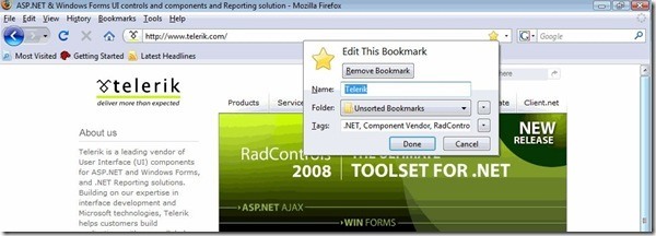 Tags, easy organization, and single-click bookmarks make keeping track of bookmarks easier and much more fun. Simply click the star button in the navigation bar to add an address to your favorites; click it again and a window pops up allowing you to organize and tag your bookmarks.