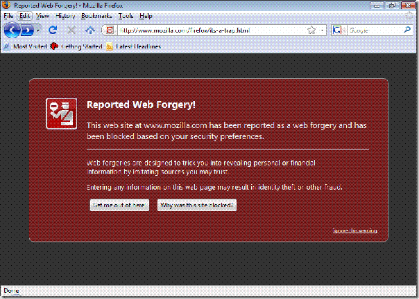 Firefox has improved the phishing protection offered in version 2 by skipping the pop-up messages and displaying a detailed warning in place of the malicious site. I know, I know, most of us geek-types won't ever see something like this because we have the lowest security settings our browser will allow and think we are too cunning be duped by a web site. But it'd be a shame if you missed out on that great sweater for your birthday because Grandma was taken to the cleaners by some online crook. All users, be they web-savvy geeks or run-of-the-mill surfers, are better protected by these upgraded security features.