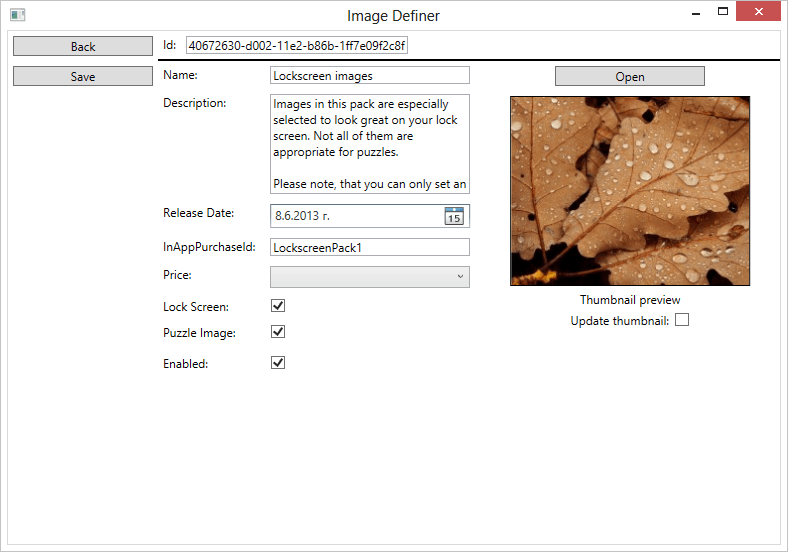 Solution: the separate image files are stored as files in Everlive. This makes them automatically available for use through the Everlive SDKs. To represent a single playable image in the game, a content type named Image was created. It groups the files for the different sizes of the image and also holds the title and the description. To group images in packs, an ImagePacks type was created. It also has a title and description, plus a cover image.The image pack also contains the in-app product ID, which is used to make the integration with the Windows Store, when a user wants to purchase the image pack. Finally, a content type was created to hold the free image of the day. It just has an ID from the Images type and a date.