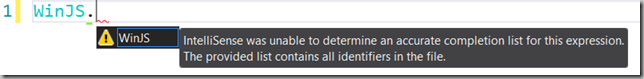I have been frustrated by Intellisense acting up when working on WinJS Windows Store applications.  Figure 1 is just an example of the quirky behavior that I’ve been experiencing: