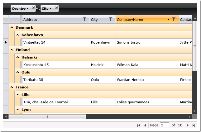 <Grid> <Grid.RowDefinitions> <RowDefinition /> <RowDefinition Height="30" /> </Grid.RowDefinitions> <riaControls:DomainDataSource x:Name="DomainDataSource1" AutoLoad="True" LoadMethodName="LoadCustomers"> <riaControls:DomainDataSource.DomainContext> <localWeb:NorthwindDomainContext /> </riaControls:DomainDataSource.DomainContext> </riaControls:DomainDataSource> <telerik:RadGridView x:Name="RadGridView1" ItemsSource="{Binding Data, ElementName=DomainDataSource1}" /> <df:DataPager x:Name="DataPager1" Grid.Row="1" PageSize="10" Source="{Binding Data, ElementName=DomainDataSource1}" /> </Grid>
