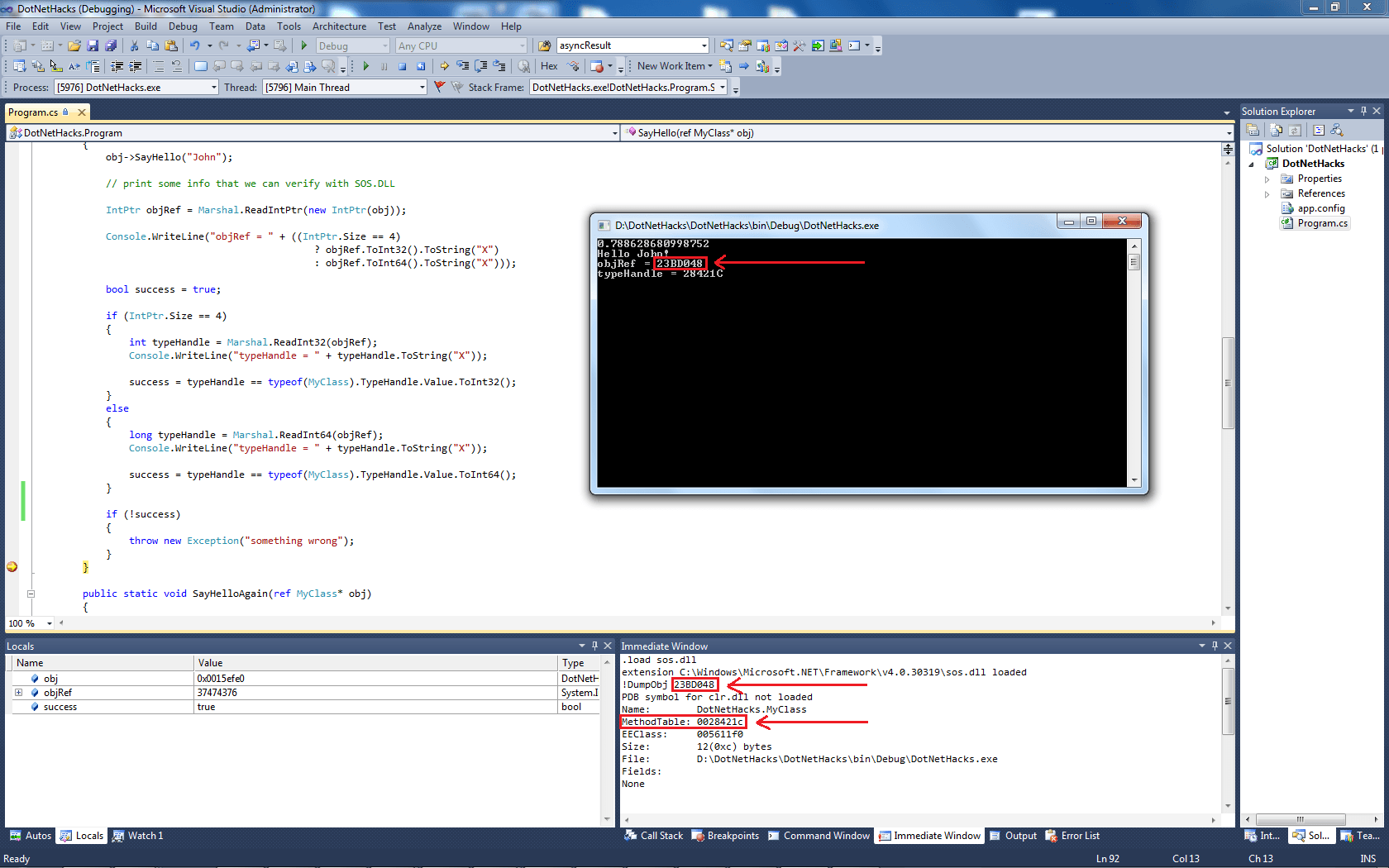 Let’s set a break point at the end of SayHello method and run the project in Debug mode. Now lets execute some commands in Immediate window (see the screenshot).