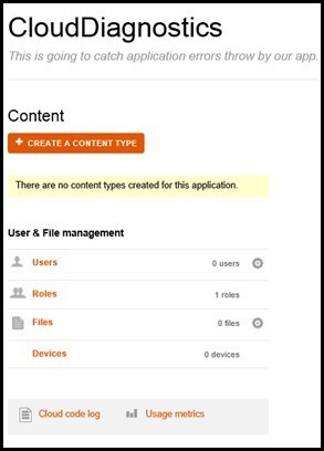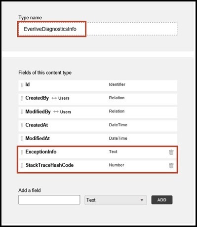 We will need to click on “Create a Content Type” and give it the name of EverliveDiagnosticsInfo with the following fields: