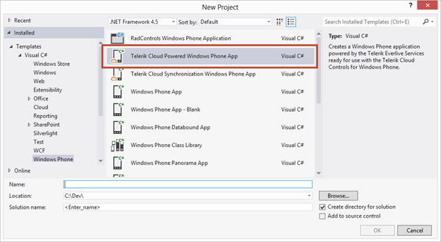 The “Telerik Cloud Powered Windows Phone App” template is where we are going to begin, so select it and give it a name and press OK.